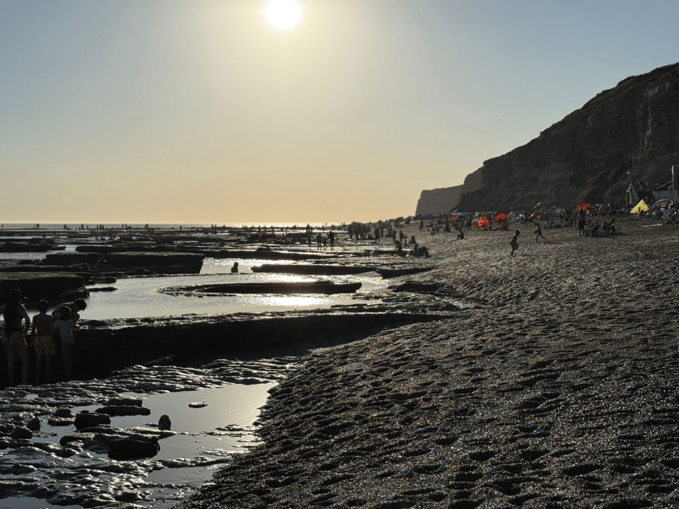 El entorno es inconfundible. Los acantilados patagónicos enmarcan la costa y acompañan el recorrido visual hasta el horizonte, mientras la luz del final del día transforma los colores de la arena, las rocas y el agua. En verano, el clima invita a quedarse hasta último momento, cuando el cielo se tiñe de rosados y naranjas y el ritmo parece desacelerarse.