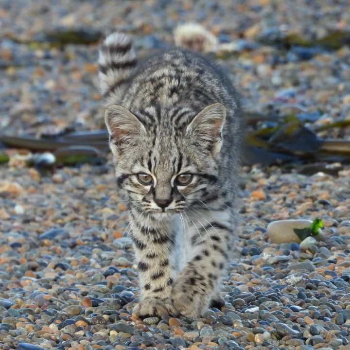 Ayer volvieron a la vigilia y otra vez los sorprendió: Estában esperando a las orcas y a las cinco, les avisaron que andaba el gato montés. «Creemos que es el mismo, andaba cerca de las gaviotas, intentó acechar pero no pasó nada. Hay muy poca gente, aparecen cuando no hay nadie y fue día ganado por más que no vimos a las orcas. Es el premio que nos da la temporada baja. Es un cachorro de gato montés confía en su camuflaje y se mueve como si nada por la playa».