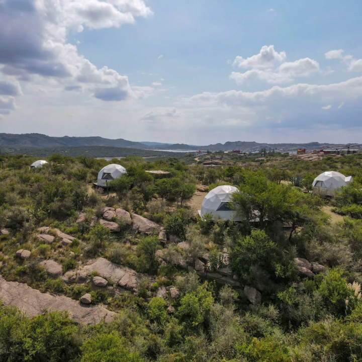 Está a los pies del Cerro Uritorco y ofrece una experiencia de alojamiento ecológico en un entorno de más de ocho hectáreas de monte serrano. Sus cuatro domos de estilo viajero vintage, con capacidad para dos o tres personas, incluyen baño privado, ropa blanca, amenities y desayuno, además de espacios compartidos como un living con electrodomésticos y asadores al aire libre. El predio también cuenta con una piscina con vistas al atardecer y un local gastronómico que prioriza ingredientes frescos y saludables.