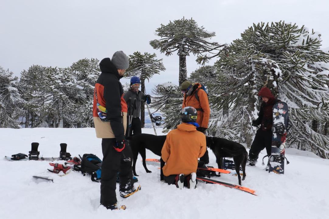 «Ya llegando al Monkol se veían huellitas como de liebre y conejo. Los perros como locos olfateando. Divino todo. Estábamos bastante quemados de piernas, porque habíamos subido desde la ruta. Nos tiramos todo derecho, seguimos bajando, llega un momento que se arma como un valle que te frena un poco, caminamos un tramito hacia arriba y nos volvimos a meter en el bosque, donde la pendiente es muy leve. Igual es hermoso porque vas dentro de un bosque de araucarias todo nevado y con ese día, más todavía. Prácticamente llegué esquiando hasta la ruta 13, donde está la entrada al Batea», relata.