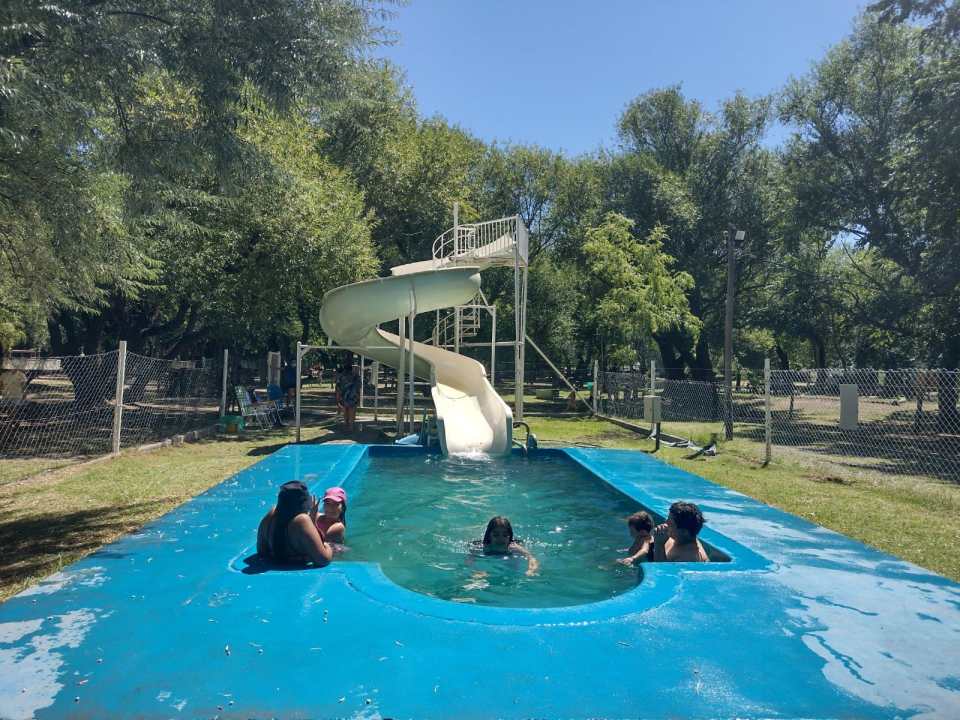 Los chicos que se tiran en el tobogán azul de agua. Por 100 pesos se pueden tirar tres veces. También hay dos dormis con capacidad para 6 personas cada una. Tiene una cama grande somier, dos cuchetas, frigobar, aire acondicionado, fogón con mesita afuera.