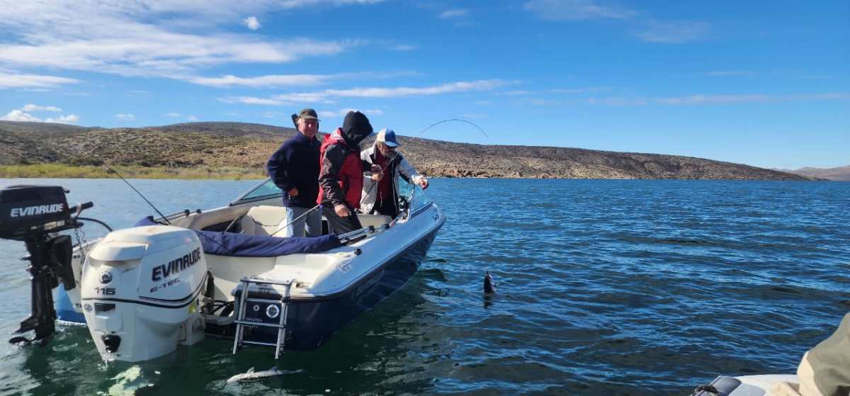 Llegar hasta el medio del lago también tuvo premio, porque había un pique de aquellos que no se olvidan. Matías y sus amigos pescaban con líneas de hundimiento rápidas y moscas de buen porte que imitaban alevinos de percas y pejerreyes, sin rebaba en los anzuelos para soltarlas rápido. Su padre y sus amigos, con cañas de spinning y cucharas.