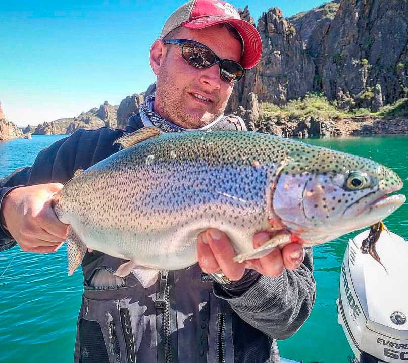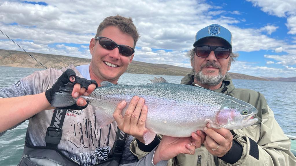 Allí abajo había un cardumen de truchas, 99% arcoíris. Por el porte, Matías sospecha que varias se escaparon de las jaulas de los criaderos. El promedio de las que pescaron pesaba alrededor de dos kilos, las más grandes unos tres kilos. «Muy buenas truchas», dice Matías.