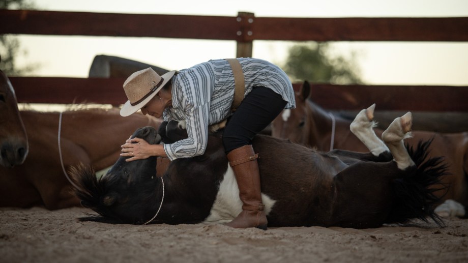 “Les enseño ejercicios para que estén conmigo, pero están sueltos, no los tengo atados a nada. Me ven con una fusta o látigo, pero solo los uso como extensión de mi brazo para poder tocar suavemente a los caballos más alejados, cuando son un montón. Jamás golpeo a un caballo; si lo hiciera, no se me acercarían. Todo lo que hago es con amor, respeto y tiempo”.