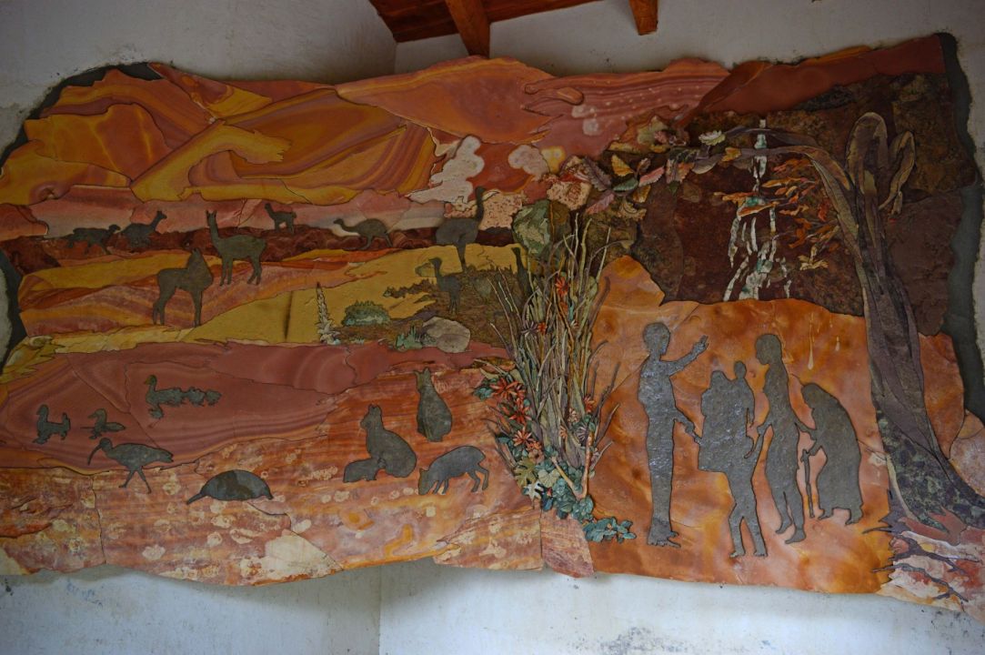 En la anteentrada, un mural de piedra representa la creación. El conjunto parece respirar. Hay bancos externos pensados para los caminantes, porque él soñó con integrar la capilla a un sendero turístico que una distintos puntos de interés de El Bolsón. Aún no se concretó, pero la idea sigue viva.