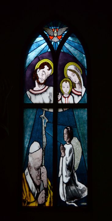 Las puertas de la capilla tienen tallados a Juan Pablo II y a Teresa de Calcuta. En los vitrales se dibujan la Sagrada Familia y el ángel arrodillado, aquel de la foto que lo unió a Susana en la infancia. En el piso, un vitral con ramos de flores recuerda su jardín.