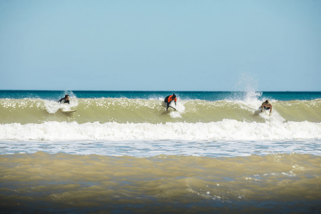 El surf completa la escena, con olas que pueden alcanzar los dos metros dependiendo de la dirección del viento y la marea. La combinación de mar abierto, sectores más protegidos y la cercanía del río generan un entorno cambiante que atrae tanto a quienes se inician como a quienes buscan entrenar con mayor exigencia.