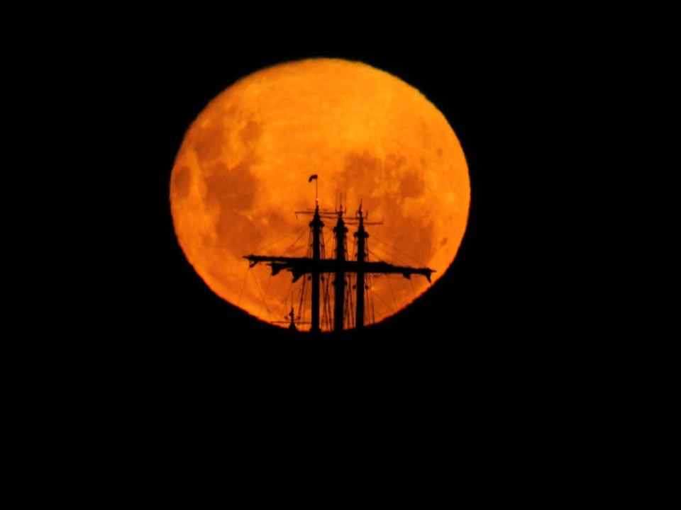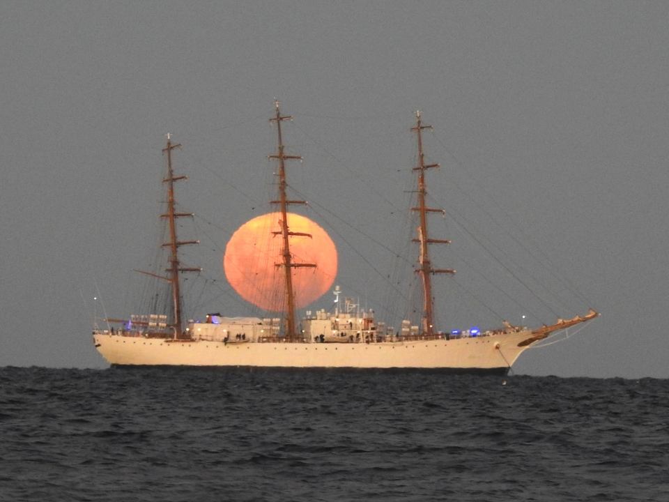 Su primera tanda de fotos fueron nada más y nada menos que con la luna de fondo, algo que le apasiona. Y la segunda, al amanecer, otra de las maravillas de vivir ahí que tanto disfruta. Si lo seguís en las redes ya sabés que suele buscar veleros como referencia para incluir en el cuadro. Y en estos días se le presentó la oportunidad de enfocar a la Fragata Libertad. No la desaprovechó.