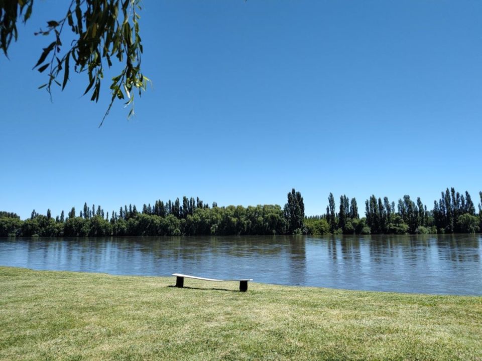 La Isla 92 es un rincón donde el paisaje manda y el reloj parece ceder ante el ritmo sereno de la corriente. La playa de piedras, tibia bajo el sol patagónico, se extiende como un anfiteatro natural. Arriba, una barranca verde, de césped prolijo, arma la postal perfecta: un lugar para sentarse a mirar sin apuro, para escuchar el ruido del río sin distracciones.