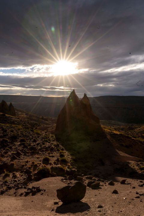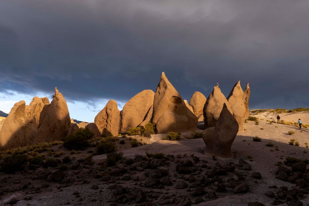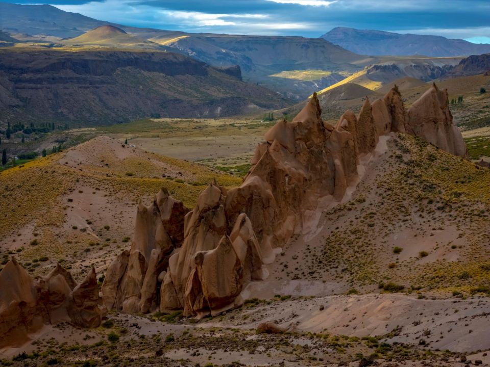 Al bajar, Damián, desde lo alto, invita a acercarse al borde de una montaña. Abajo, las formaciones irrumpen en medio de la estepa como un ejército de piedra detenido en el tiempo. Son rocas de origen volcánico, moldeadas durante miles de años por el viento, las lluvias, las heladas y el sol. Algunas parecen agujas. Otras recuerdan columnas, conos, un pez, un guerrero, una flor, figuras humanas o animales: cada uno ve lo que quiere.