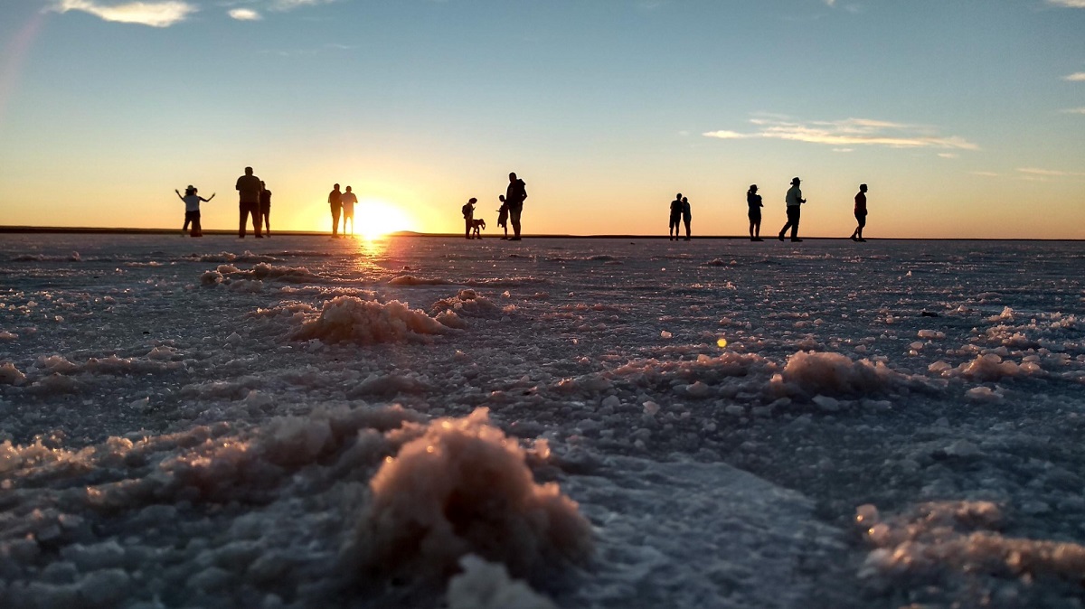 «Dentro del salar parece que estamos en la Luna. Atardece. En el corazón del Gualicho nos detenemos después de recorrer varios kilómetros y descendemos del vehículo. El guía nos invita a sentir la sal bajo nuestros pies. Descalzos caminamos hacia el oeste, la mirada se pierde en el horizonte, el cielo se va poniendo amarillo, luego rojo y por último el violeta invade el firmamento (…)», invitan.