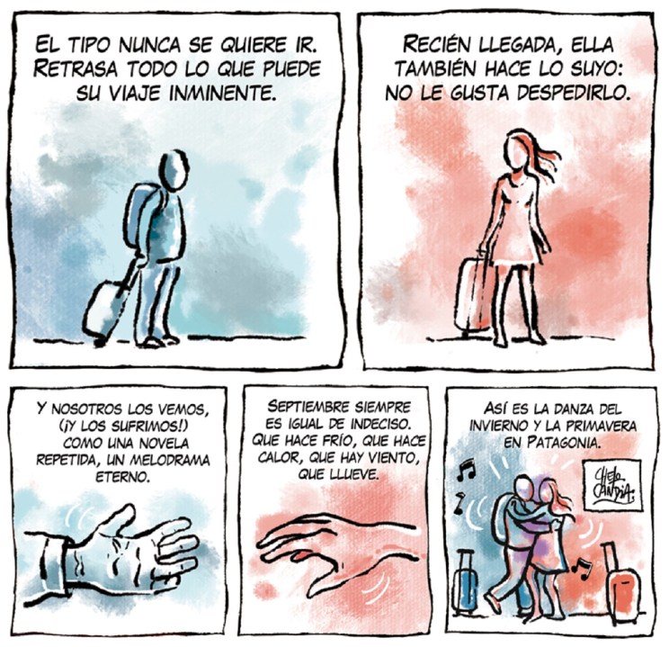 La tira Viajeros, sale los domingos en el suple de viajes y turismo Voy de Diario RÍO NEGRO.
