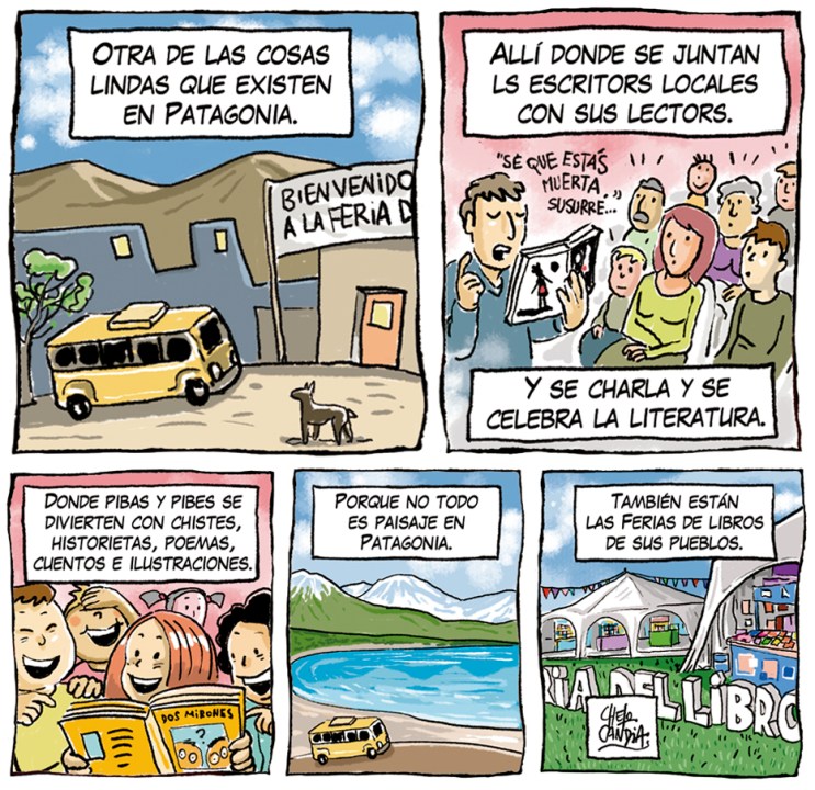 «No todo es paisaje en Patagonia» es la nueva versión de «Viajeros», la tira de Chelo Candia que se publica todos los domingos en el suplemento Voy. A disfrutar de esta tira que habla de la Patagonia, ferias de libros, escritores y literatura.