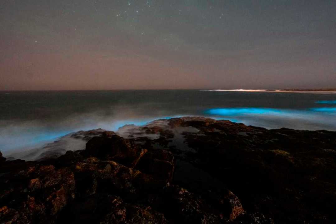 Como si hubiesen colocado reflectores debajo del agua, el mar estaba iluminado en una enorme porción que cubre el cordón costero. Semejante a una aurora boreal marítima, el vaivén de las olas intensificaba los colores verduzco-azulados.