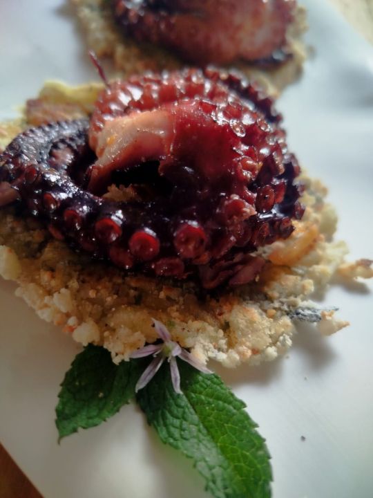 No hay carta fija. El menú depende de lo que el día regaló. Suele empezar con una entrada de mejillones, lapas y mariscos recién recolectados. Las algas, protagonistas silenciosas, aparecen en escabeches o integradas a pastas caseras rellenas de pescado fresco. Si la noche es templada, el fuego toma el centro y el pescado va a la parrilla. En invierno, la escena se traslada adentro y el calor viene de la plancha o de una olla humeante.