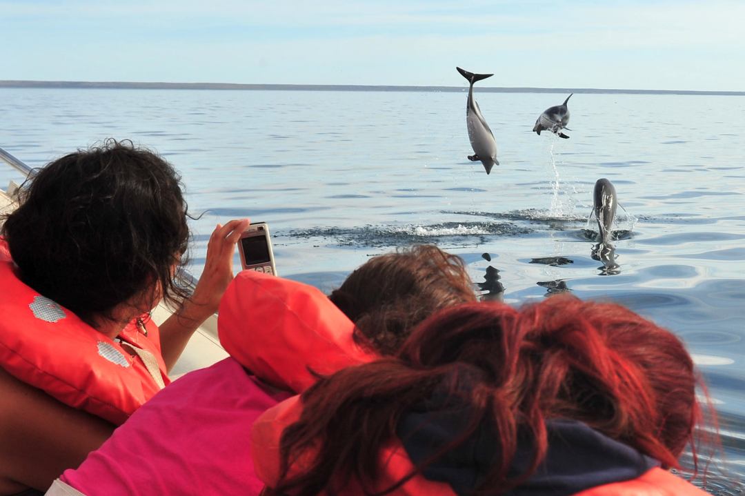 En el Golfo Nuevo, los delfines oscuros también ofrecen su propia función. Saltan y giran en una acrobacia natural que arranca exclamaciones de asombro. Estos cetáceos pueden ser vistos en excursiones náuticas que parten desde el puerto de la ciudad.