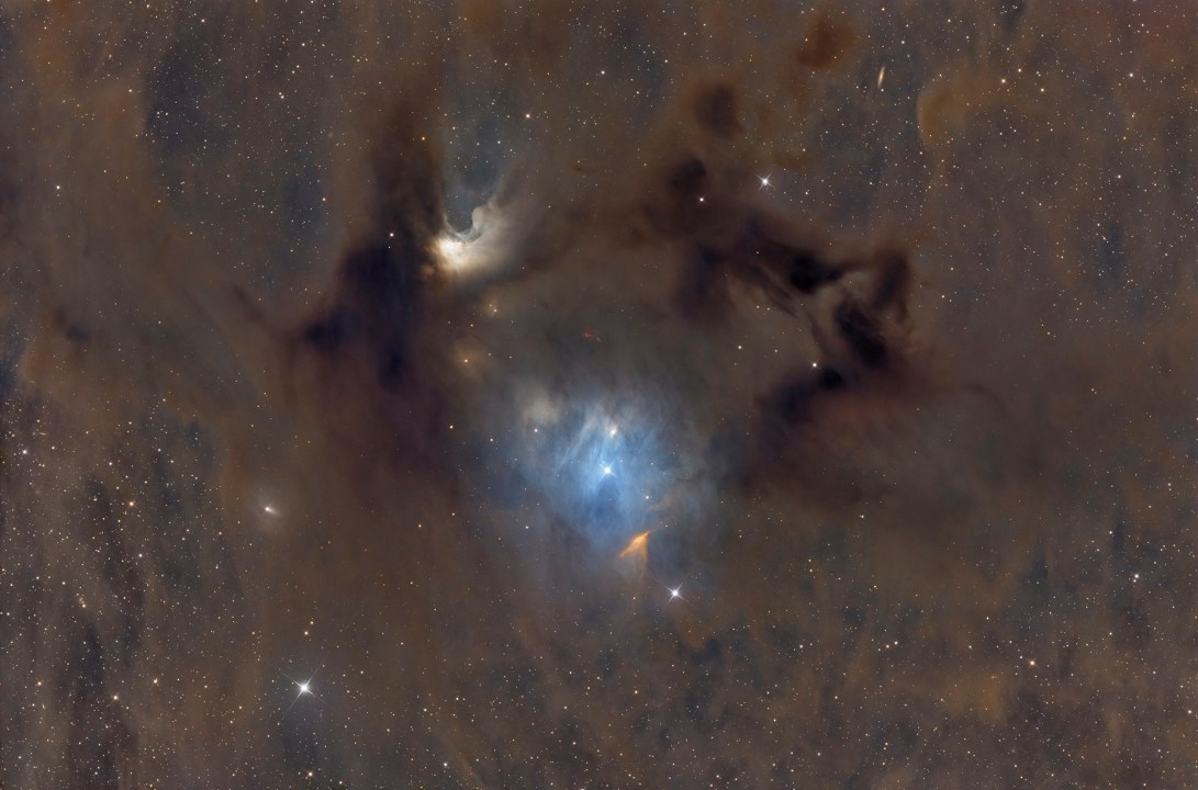 Con precisión técnica, describe lo que fotografió ahora: “Es una nube molecular de Camaleón I. En el interior de esta nube, a unos 650 años luz, se desarrolla una activa región de formación estelar. Se destacan la nebulosa polvorienta con forma de C (Ced 110), la azulada Ced 111 y la Nebulosa Infrarroja del Camaleón (Cha IRN), con su característica forma en V y tonos anaranjados, esculpida por los flujos de gas de una estrella joven”, escribe. Estas estructuras, inmersas en gas y polvo interestelar, revelan las primeras etapas del nacimiento de nuevas estrellas en una de las regiones más cercanas al sistema solar.