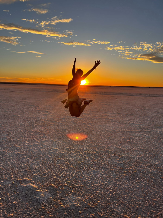 El atardecer transforma por completo el escenario. El suelo blanco refleja los colores del cielo, que pasan del amarillo al rojo y luego a los tonos violetas, creando una postal que remite a paisajes lunares. Caminar sobre la sal, detenerse a contemplar el horizonte y compartir un brindis en medio de la inmensidad se convierten en momentos difíciles de olvidar.