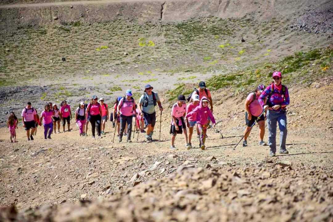 Bajo la única consigna de llevar un detalle de color rosa en la vestimenta, hombres, mujeres y niños fueron protagonistas de una emocionante a jornada que se inició con un ascenso en telecabina desde la base de Chapelco hasta Plataforma 1600. Desde allí comenzó la caminata por senderos y pistas del centro de esquí que culminó con una trepada en los últimos metros, para llegar a la cumbre del Cerro Teta, en un recorrido de 2,6km.