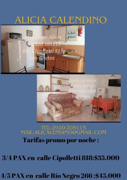 Otras opciones están ubicadas en Cipolletti 818, y ofertan $35.000 diarios para viviendas con capacidad de tres a cuatro pasajeros, y $45.000 en el caso de las que son para cuatro o cinco personas, y se ubican en Río Negro 266.