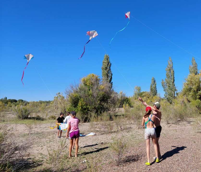 Remontamos barriletes con los chicos, buscamos y acopiamos leña desde la isla de enfrente. Kayakeamos por el arroyón contiguo al camping. Armamos un súper torneo de fútbol tenis, vóley.