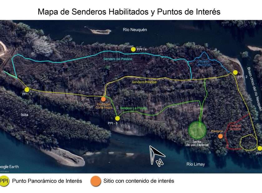 PPI-5: La Playita. Este punto permite una vista muy atractiva de la islita, el brazo chico y el brazo principal del río Limay. Este sector es ideal para sentarse a tomar mate (sin generar basura).