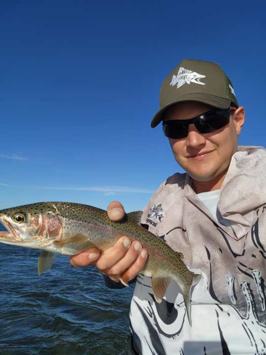 «Por eso usamos moscas de alevinos verdes, anaranjadas, marrones, negras, fueron las que más resultados nos dieron», describe Matías. En cuanto a cañas, utilizaron número 7 y líneas de triple densidad de hundimiento rápido para que las moscas bajen ya que las percas se mueven en el fondo, explica.