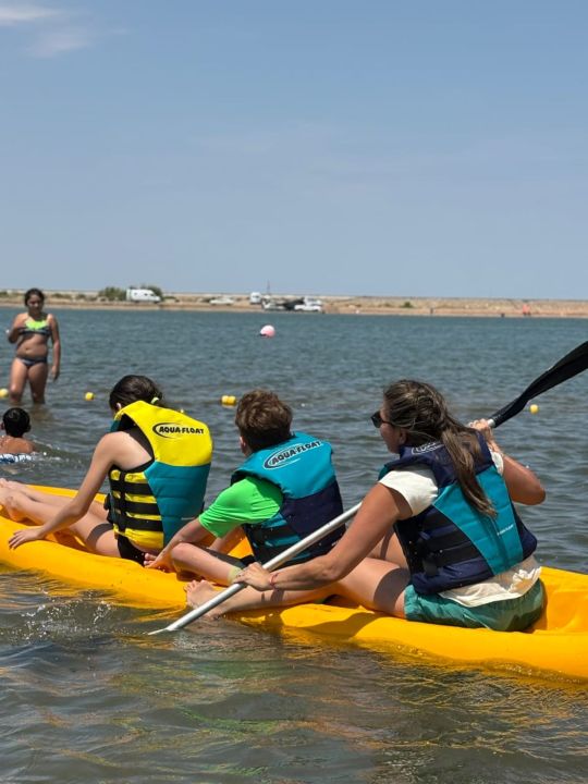 Casa de Piedra aparece en verano como una sorpresa en medio del monte pampeano. Después de kilómetros de jarillas y rutas rectas, el paisaje se abre de golpe y el embalse se muestra sereno, de un verde cristalino que invita a quedarse. No hay olas, pero la sensación es parecida al mar: horizonte abierto, brisa constante y una playa extensa donde cada actividad tiene su espacio.