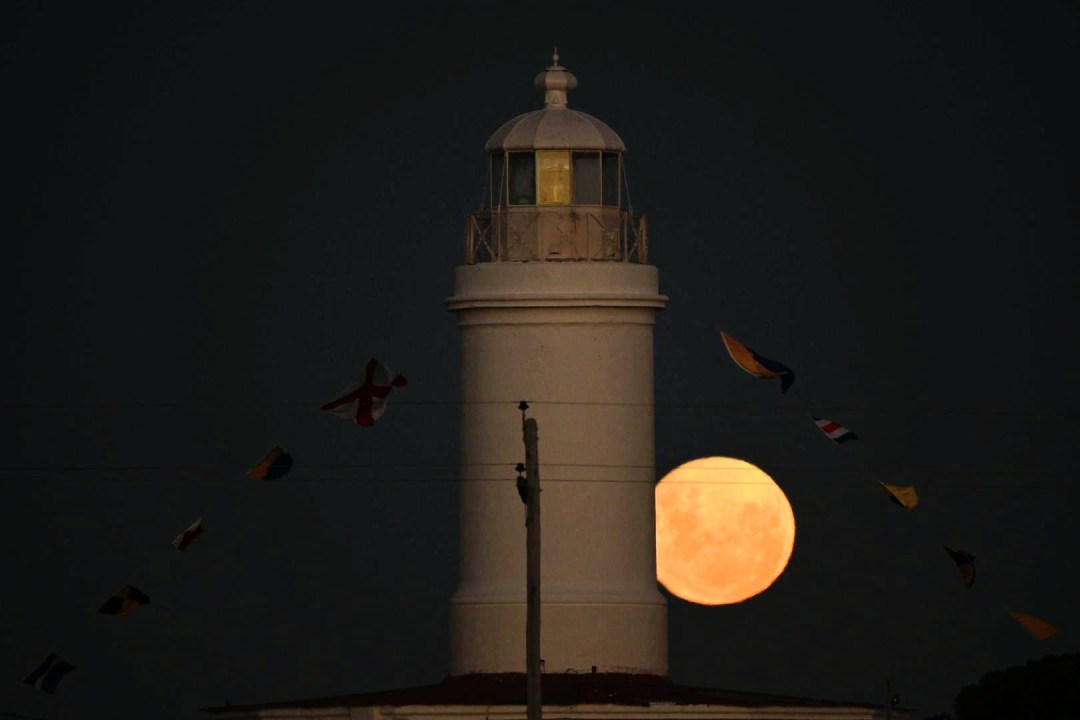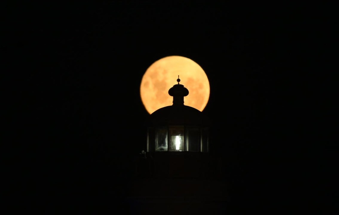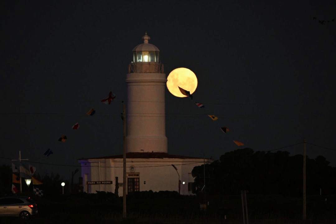 Una foto que esperó años: la luna llena se alineó con el Faro Río Negro en El Cóndor