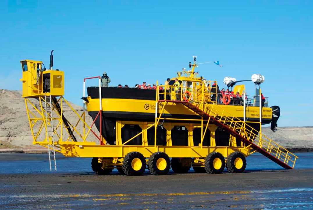 El Yellow navega desde hace 8 años, y fue creado especialmente en un astillero de Mar del Plata, en la costa de Buenos Aires. Cuándo se lo ve desde la orilla parece una embarcación común, pero es una caja de sorpresas. Debajo de la línea de flotación se incluyeron dos niveles a los que se accede mediante escaleras. A cada lado, esa estructura tiene 20 ventanillas desde las que se ve claramente la vida submarina. Por eso, después de apreciar las piruetas de los cetáceos desde cubierta, se puede bajar para verlos en plenitud, desde la vista magnífica que ofrecen las ventanas que se abren a los misterios del mar.