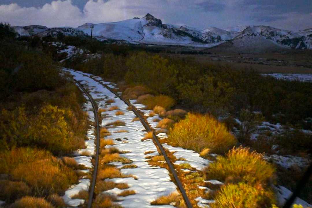 Durante el viaje se puede contemplar el paisaje de transición de la cordillera a la estepa, con montañas bajas nevadas e inmensos campos pintados de blanco. Cada tanto, una liebre se cruza delante de las vías o corre a la par del tren entre coirones y neneos.