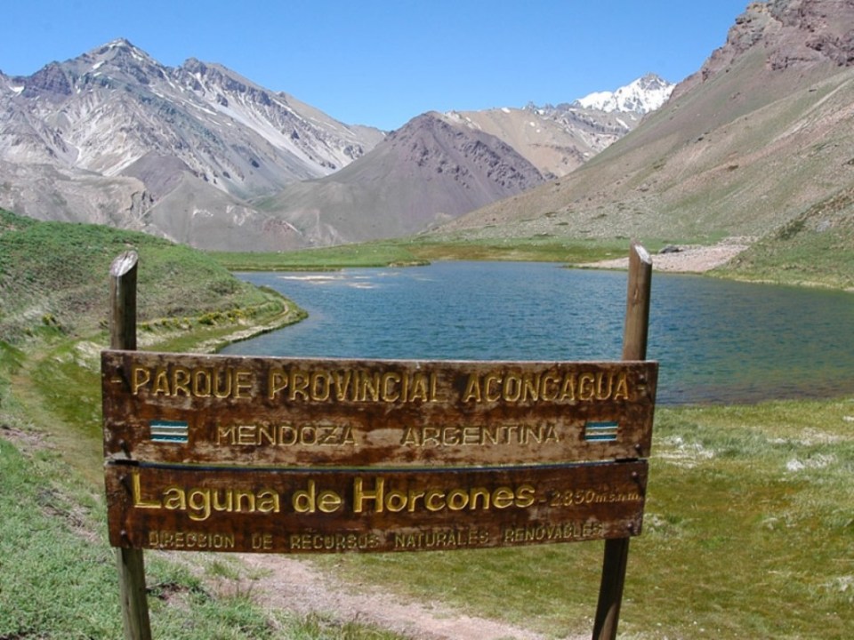 Para ver la pared sur del cerro Aconcagua con sus glaciares colgantes se puede caminar por un sendero de dos kilómetros en el circuito Laguna de Horcones, que forma parte de un pequeño humedal con cinco espejos de agua.