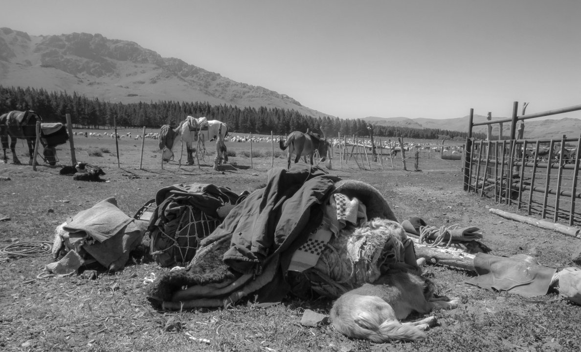 «…Había una vez un río que dormía tranquilo en aquella serena laguna que está ahí arriba. Un día, hace ya cientos de miles de millones de cosas, a unos tipos se les ocurrió criar chivos, ovejas, vacas, burros y caballos y el río se tuvo que desperezar y ponerse a trabajar y abrir canales, cascadas y arroyos y a correr y despertar a los lechos por los que iba que, también como él, estaban durmiendo, aburridos, desde hacía tantas cosas…Y mientras corría, cantaba y le avisaba al resto que iba a regar los prados para que se llenaron de verdes pastos y hermosas flores que adornaban el paisaje de aquellos hermosos cerros blanqueados de nieve y pardos de coirones y que solo el cóndor podía ver desde allá arriba sin poder creer la maravilla que le estaba sucediendo a su maravilloso reino. Y las tardes y las mañanas se llenaron de rocíó. Y se fueron sumando más y más personas que criaban más y más animales. Y junto con el río, todos los valles se despertaron de alegría y un aroma a vida y frescura invadía todo lo que el agua tocaba y las personas con sus animales hacían más canales para regar más mallines. La laguna, entonces, junto con el río, los canales y arroyos y la nieve y las estrellas y los pájaros y el viento invitaron a los paisanos y sus perros a que no se fueran…¡¡Qué por favor se quedaran…!! Y así fue que se asentaron e hicieron sus ranchos con las pocas cosas que allí había…Y entonces, laguna, cielos, cerros, arroyos, pastos, paisanos y animales terminaron siendo, a los ojos del cóndor, una sola cosa. Un solo paisaje, irremediablemente indivisible…”