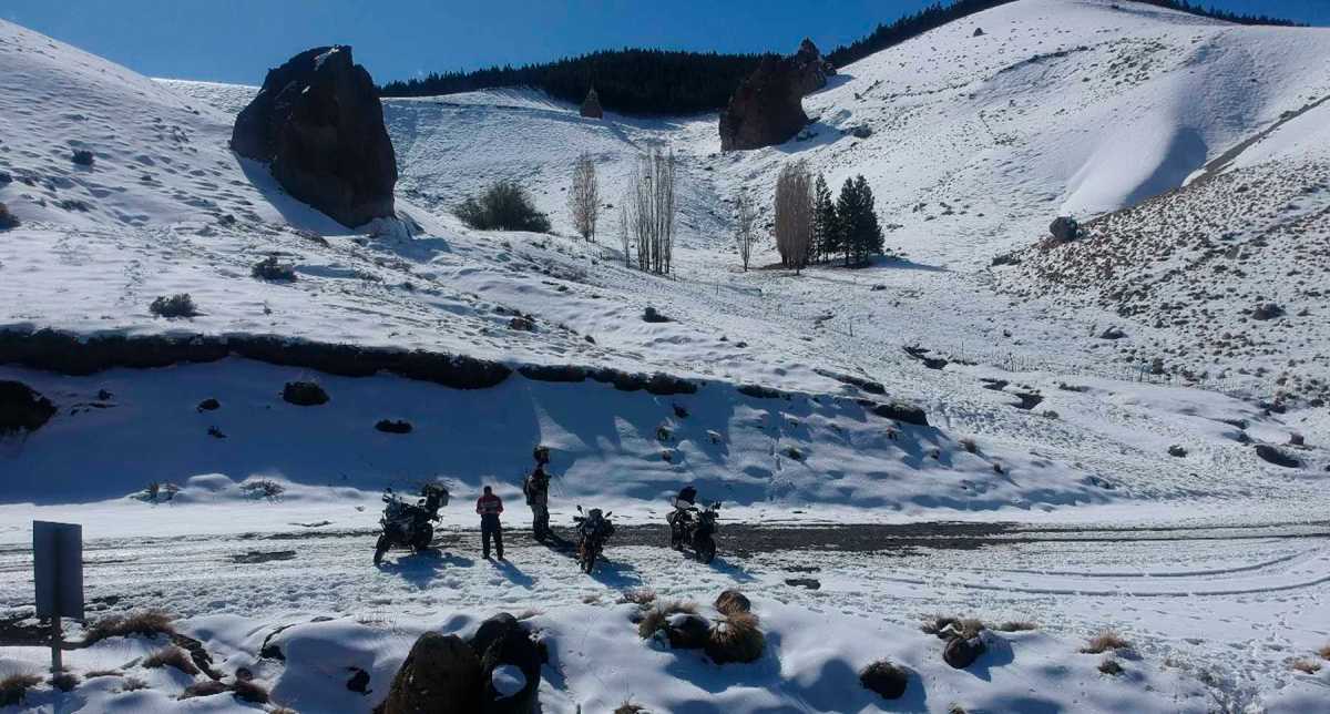 La aventura en moto de cuatro amigos por los paisajes más lindos de la Patagonia entre la nieve del norte neuquino