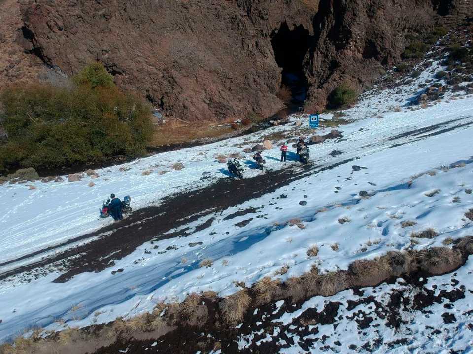 Al día siguiente amanecimos con un gallo dormilón, desayuno contundente y a emprender la aventura continuando por la ruta 43 hacia Termas de Aguas Calientes. La nieve comenzó a invadir nuestro camino y por momentos dejaba solo una huella para transitarlo. Sin embargo, si no era nieve, era barro, y nuestras motos comenzaron a deslizarse de un lado al otro.