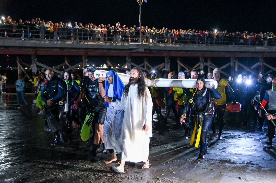 Nadadores, snorkelistas y un selecto grupo de buceadores tuvieron la especial tarea del traslado de la cruz iluminada por el fondo del mar. Allí, realizaron las 3 estaciones restantes y emergieron a la playa donde los esperaba el público y el Coro Municipal de Puerto Madryn cerró la ceremonia.