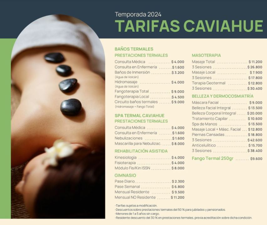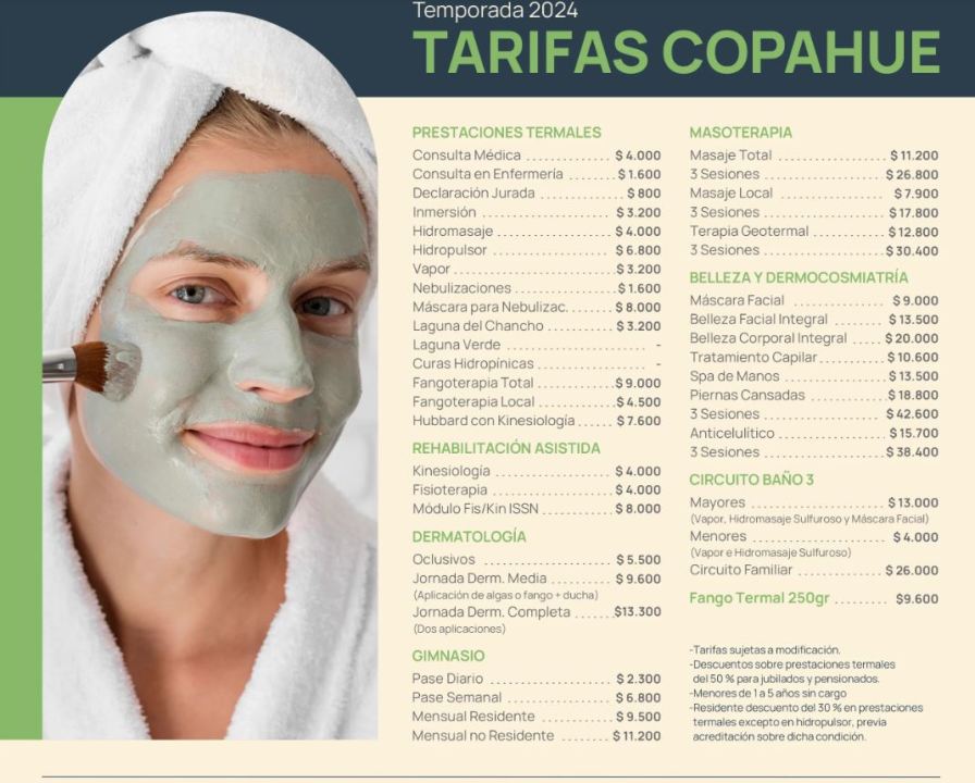 Estos son los servicios y las tarifas que publica Copahue tanto en la villa termal como en el centro de atención en Caviahue: