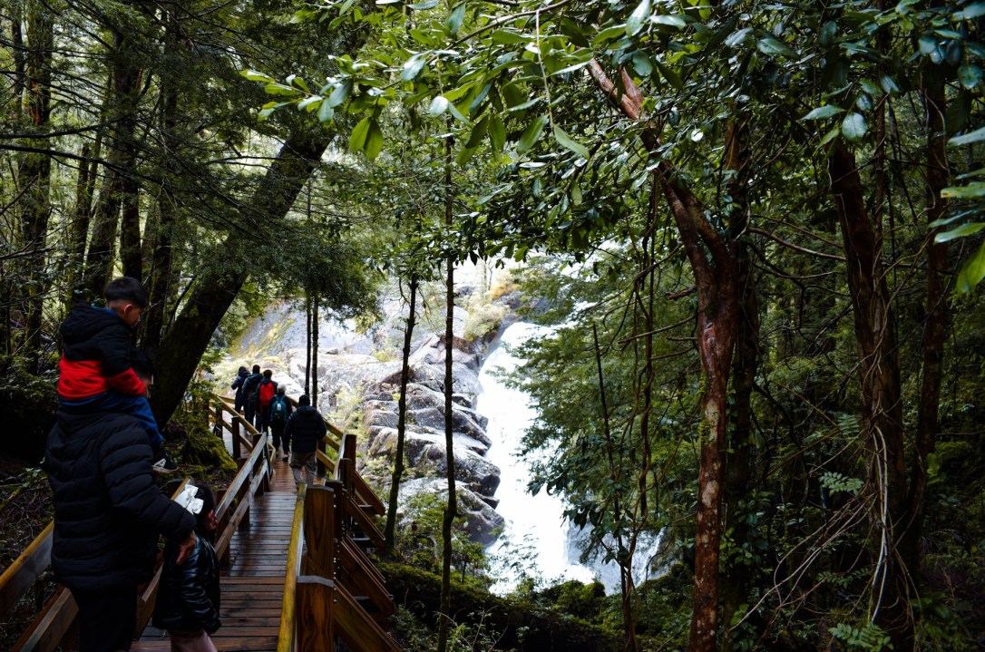 El recorrido comienza en un pequeño muelle al que se arriba en la nave y, desde allí, se inicia una caminata que invita a la pausa y la contemplación. El sendero se abre paso entre un bosque valdiviano húmedo, tupido y verde, donde el sonido del agua ya anticipa lo que está por venir.
