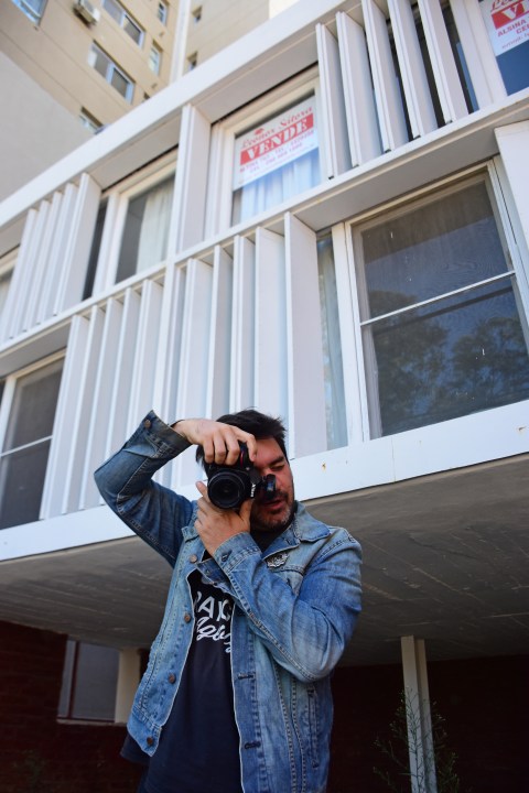 En acción, frente a una de las casas que fotografió por fuera y por dentro (Foto: Emiliana Cantera)