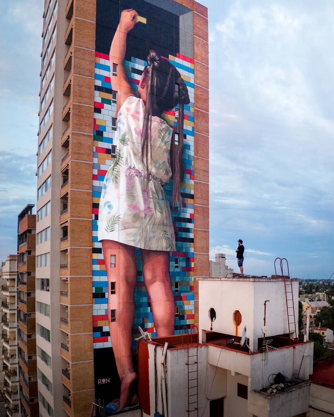 Con un proyecto de tres grandes murales sobre medianeras de edificios en el conurbano bonaerense, dos entre 2020 y 2021 y el último para el año próximo, el muralista Martín Ron cierra la trilogía de niños y globos en forma de corazón, y explica, en diálogo con Télam, que volver «después de un año era reconectar otra vez con dominar no solo la escala sino también el miedo a las alturas».
