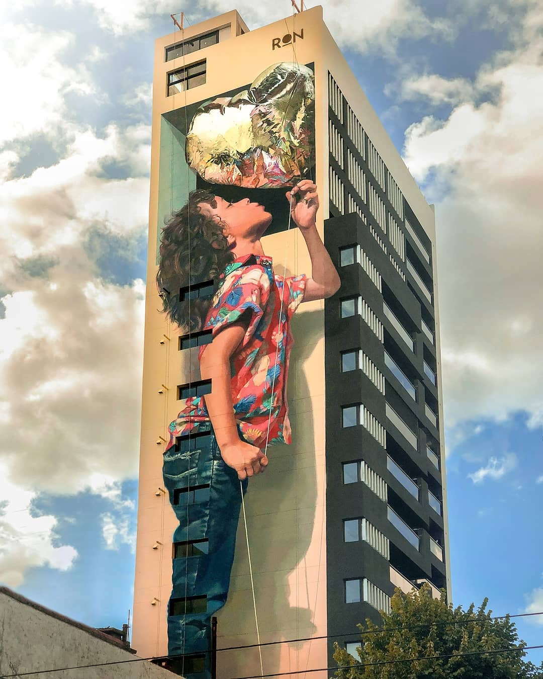 «Recuerdo de mis últimos días desde las alturas. Esta obra tenía muchos desafíos, y decidí sumarle uno más: lograr la textura metalizada del globo. Después de plantar el diseño sobre la medianera empecé a resolverlo inmediatamente. Pasamos varios días trabajándola junto a @mcparri y @nicolasdicianno hasta que un día nos paramos a mirarlo desde la esquina y el globo volaba por si solo», comparte con total felicidad Martín Ron.
