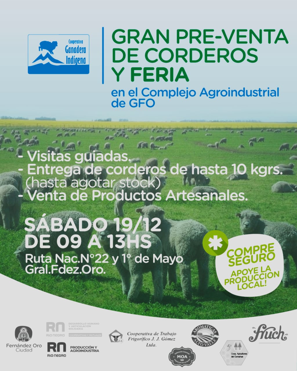 En el Complejo Agroindustrial de Fernández Oro, el próximo sábado 19 de diciembre, de 9 a 13, se llevará a cabo una feria artesanal y venta de corderos. Durante esta semana se deberán hacer las reservas.
