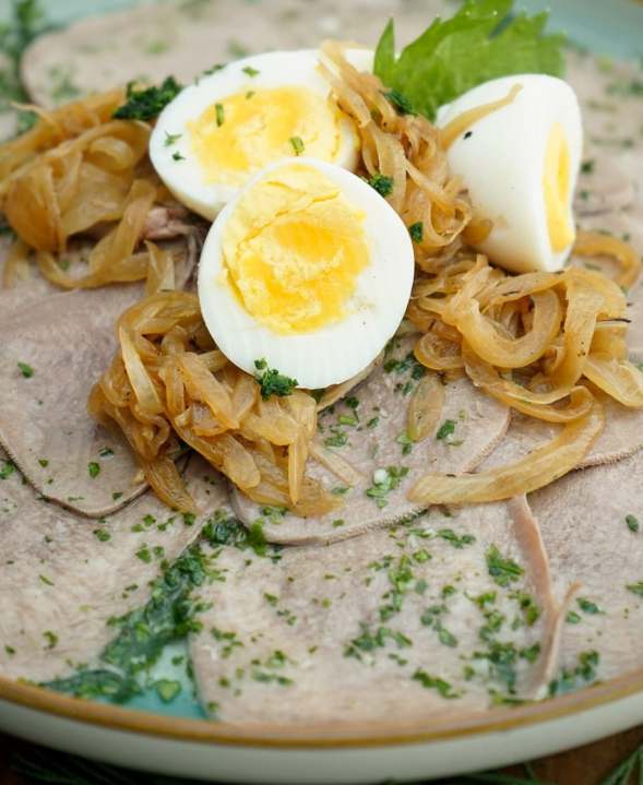 Cortar en láminas de 1 cm de espesor y disponer en un recipiente. Por otra parte, en un bol mezclar el vinagre, el aceite, el ajo, el perejil, sal y pimienta. Volcar sobre la lengua y completar con cebolla caramelizada y huevo duro en rodajas. Conservar en heladera hasta el momento de comer.