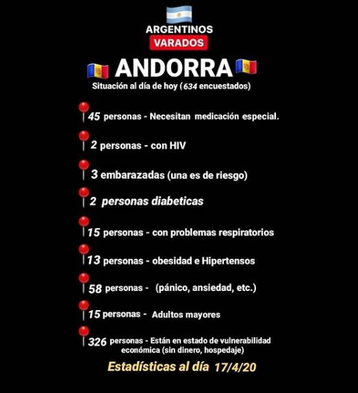 Hay casos como el de Marina López, que atraviesa un embarazo de riesgo y por eso en el grupo Argentinos varados en Andorra la ubicaron como regreso prioritario. En un relevamiento con 634 encuestados al 17 de abril, hay otros dos embarazos, 45 personas con necesidad de medicación especial, 90 con otras enfermedades y trastornos psicológicos y 326 sin dinero ni hospedaje.