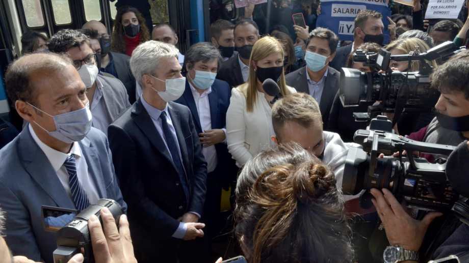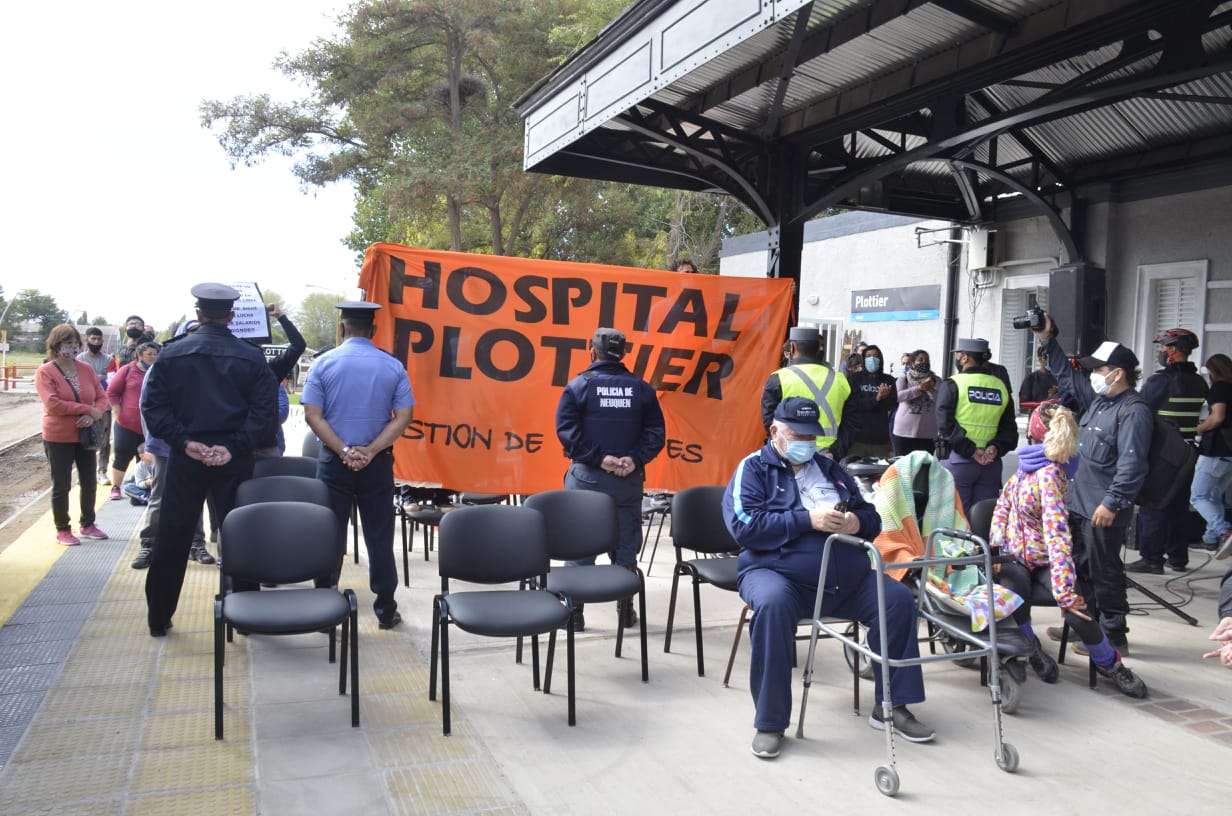 En Plottier, en el anden de la estación local, fueron recibidos por la intendenta Gloria Ruiz y a posterior se realizó la firma del convenio de reinicio del servicio de pasajeros del Tren del Valle. Sin embargo, allí también estaban los trabajadores autoconvocados de Salud que reclaman contra el aumento salarial acordado por el Ejecutivo provincial y el gremio ATE y piden ser incluidos en las negociaciones.