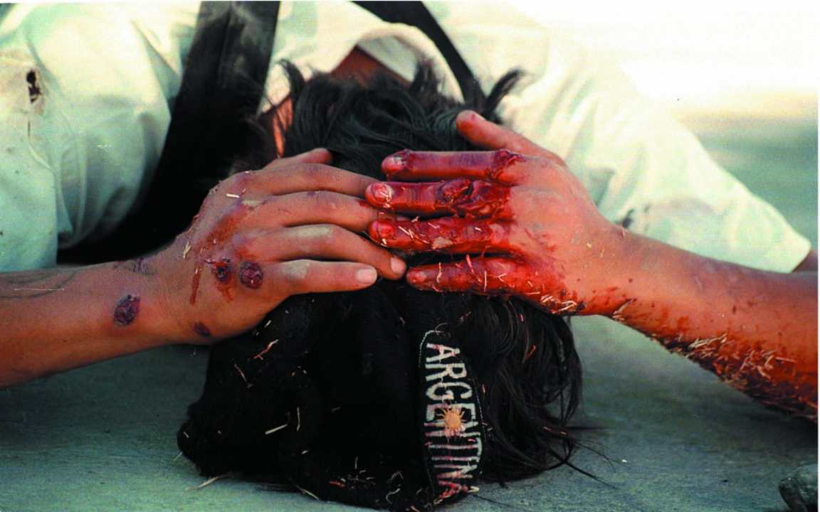 «En el centro del cuadro hay un hombre cuyo rostro no podemos ver. Tirado boca abajo, se cubre la cabeza con las manos. De sus hombros cuelga el correaje de una mochila. Tampoco podemos ver las escopetas que lo apuntan, pero sí vemos sus manos ensangrentadas, sus dedos deformados, aplastados por los impactos de las balas de goma policiales. El hombre del centro del cuadro aprieta entre sus manos un gorro que dice, en letras que alguna vez fueron blancas y ahora están sucias de polvo y sangre, Argentina. Hay un sol, entre la E y la N, sin rostro. Como el hombre en el suelo. Como el policía que le disparó.