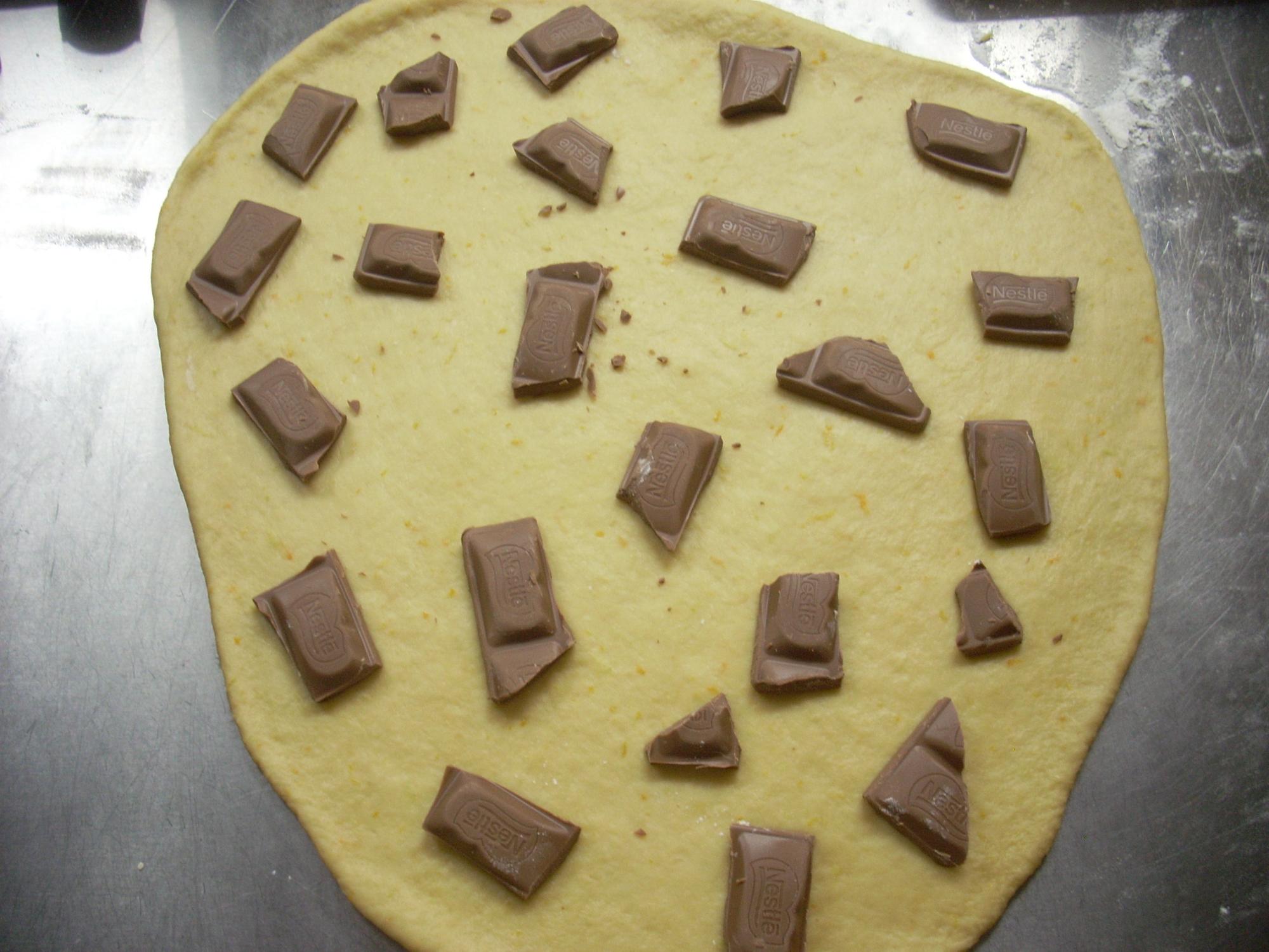 Enrrollar y amasar un poco. Hacer 2 bollos de 500 gramos cada uno. Estirar nuevamente con palote y rellenar con chocolate ó nueces ó azúcar y pasas, lo que más te guste! Con codo enharinado hacer un huequito en el centro y hacer forma de rosca. Si se quiere poner un aro pequeño en la rosca rellena para que no se deforme en la cocción.